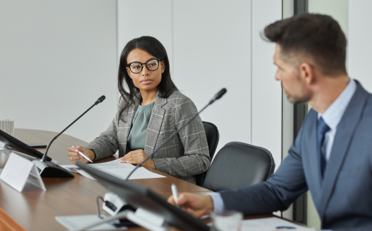 • A confident nonprofit leader stands to present in a boardroom filled with diverse professionals, symbolizing strategic planning, collaboration, and forward-thinking fundraising practices.